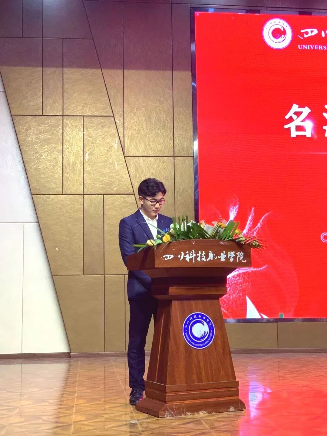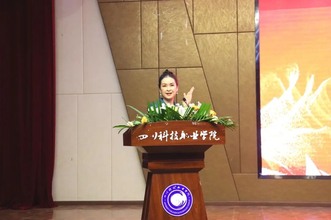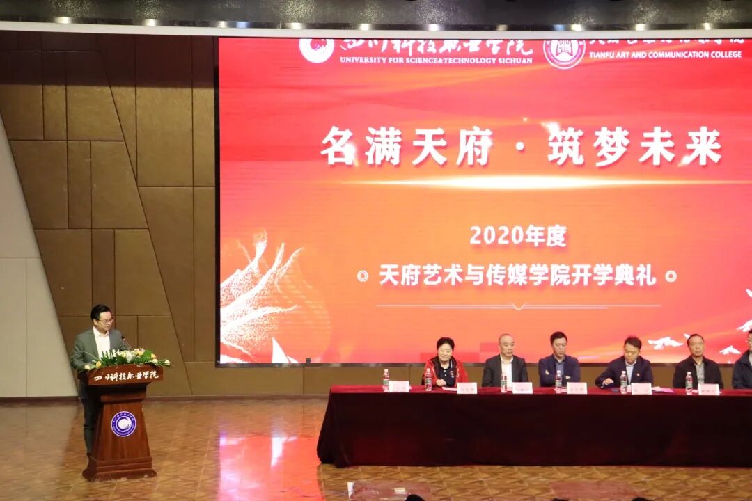 典礼在我院余平洪老师带来的一首《最美的太阳》拉开帷幕。      全场齐唱国歌后,我院党总支书记郑欢致欢迎词。首先代表学院党政领导和全体师生员工,对新同学的到来表示热烈地欢迎。     郑书记表示:2020年将注定被载入史册。党中央带领全国人民众志成城、奋起抗疫,取得了抗击新冠疫情的重大战略成果。与此同时,同学们一边抗击疫情,一边奋战高考,跨过了前所未有的困难与艰辛,成为了一名骄傲的“天府艺传人”!     接着我院院长汤兴路对同学们发表了热情洋溢的讲话。他首先代表全校教职员工对新同学的到来表示热烈欢迎。他从“梦想”“选择“坚持”三个方面深入阐释了大学的本质、学校的人才培养目标以及对大学生活规划的指导建议。他指出:大学生活对于进入其中的每个学子来讲,既是一次增长知识的奇妙旅程,也是一次增长智慧的潜心修行,大学既是点燃那盏心灯的火花,也是仗剑江湖前的“内功”修炼场所,更是获得打通任督二脉口诀心法的圣殿。     其实在开学前,学院也听闻了很多质疑的声音,但面对汤院长此次讲话时都不攻自破,止谤莫如修身,学校通过“产教深度融合,校企密切合作”,为同学们搭建起现代化、专业化和实战化的教育平台,这才是一名教育工作者真正做的事。      四川科技职业学院陈宇校长在典礼上发表讲话,他殷切寄语新生,希望同学们一要有挚诚的理想,二要有明确的目标,三要有可行的计划,四要有踏实的行动,五要有坚韧的毅力,在大学里,培育健全人格,思考人生价值,提高学术修养,释放理想光芒,使自己成为有担当精神、有创造力的新一代国家建设者。明确指出我院学前教育特色班,这种独特的创新模式相比于传统幼师,在毕业应聘或工作时能有更多优势,以企业需求为标准培养的“多能一专”型的人才,才是被今后就业环境所需要的。       我院声乐教师周云培作为教师代表发言,以自身经验为例鼓励我们的同学,一要潜心学习,二要勇敢洒脱,三要强健体魄,进入大学校园不仅意味着正式成为一名大学生,更意味着接受新的挑战。她希望同学们珍惜在川科求学的机会,努力做到求知所饥、虚心若愚,以浓墨重彩谱写属于自己的天府艺新篇章。      2020级播音主持系新生赵胤懿作为新生代表发言,认为大学不是终点,而是起点,在院训“善教、乐学、尚美、创新”的熏陶下,合理利用大学时光,用奋斗的姿态塑造更优秀的自我,为祖国的发展建设做出贡献。 不负韶华,乘着新时代的浩荡东风,带着一颗感恩的心,一份坚持与信念,以责任和担当为使命,架起理想的风帆,从川科·天府艺传起航!