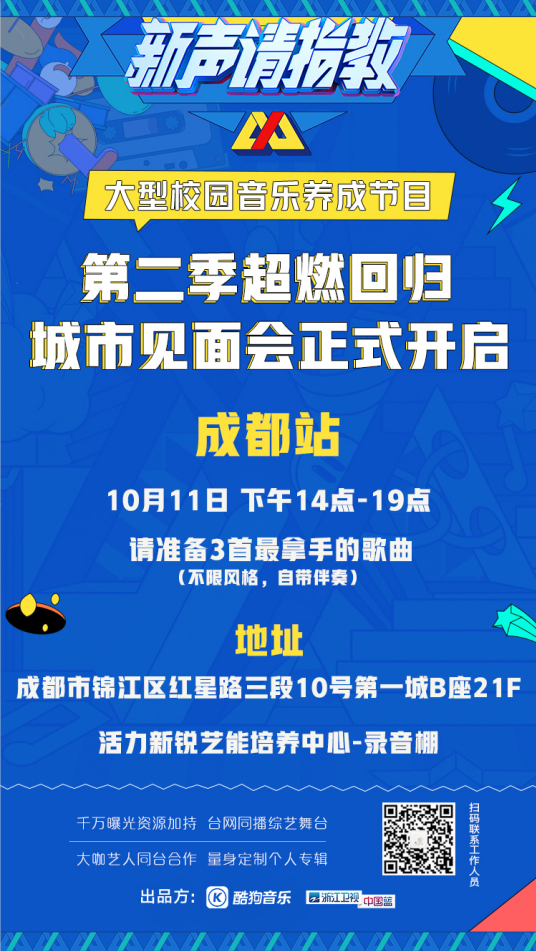 《新声请指教》初来驾到 请同学们多多指教! 是的,你没有看错 浙江卫视《新声请指教》第二季 火热招募新生啦 身为天府艺传的学子当然是有福利哦,不用跑那么远参加见面会。明天下午4:00,天府艺传教学楼,届时会有工作人员联合ETM活力时代娱乐公司进行初选见面会! 《新声请指教》第一季是由酷狗音乐联合浙江卫视出品,腾讯音乐娱乐集团百亿工作室和新界面传媒联合制作的音乐教育实践节目,由汪苏泷、薛凯琪(第七期开始由萨顶顶接替)、宝石Gem担任新声班主任。 该节目由来自15所高校的50名充满青春活力的学生正式到“音超学院”报到,交流音乐、收获友谊,实现音乐梦想 。 这么多明星导师,难道你不想拥有一个机会去零距离接受他们的指导吗?明天下午四点,此次联合出品单位:国内演艺产业新锐力量,集新人孵化、内容制作及艺人经纪的综合型娱乐公司——ETM活力时代,也是我们的校企合作单位,将针对天府艺传的同学单独进行学员公开招募。 你是否有那么一个愿望,想站在聚光灯下成为万众瞩目的娱乐新星,让所有聚光灯都集中在你的身上!只要你有这个愿望、魄力和胆识,只要你有足够的自信,哪怕你是一张白纸,这里就将会有你的舞台! 有意参加的同学可添加向老师微信:18140091617